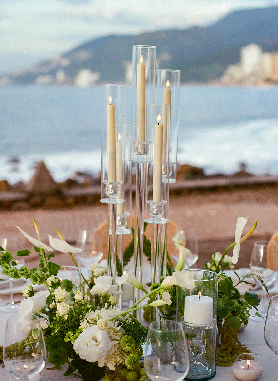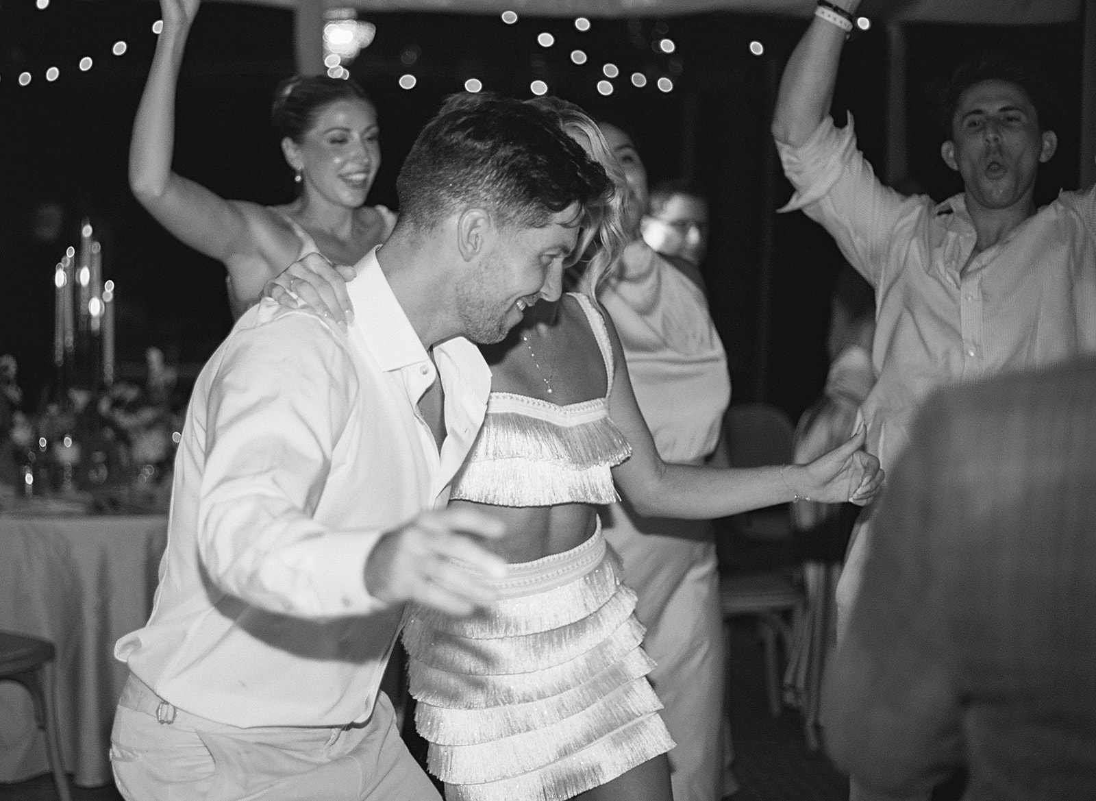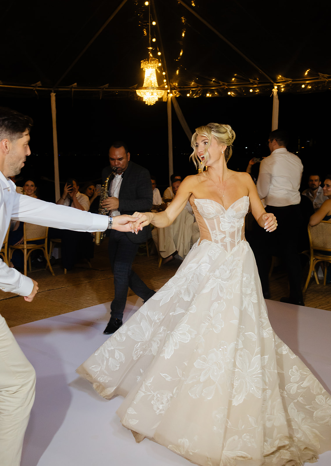 As the evening unfolded, the atmosphere shifted from quiet intention to collective celebration. The reception, held beneath a clear-span tent along the sandy shoreline of the property, felt immersive in both sound and color. Live cooking stations serving street tacos and fresh churros created a sense of movement and interaction, reinforcing the experiential nature of the event rather than a more traditional seated dinner format.