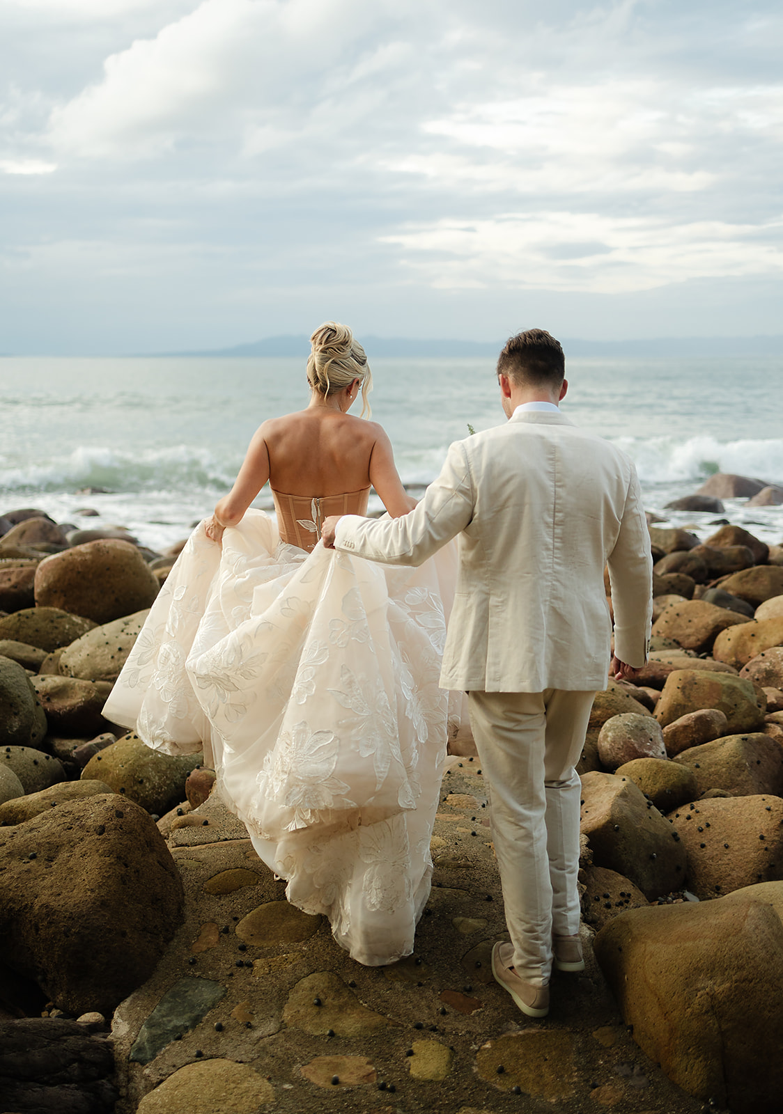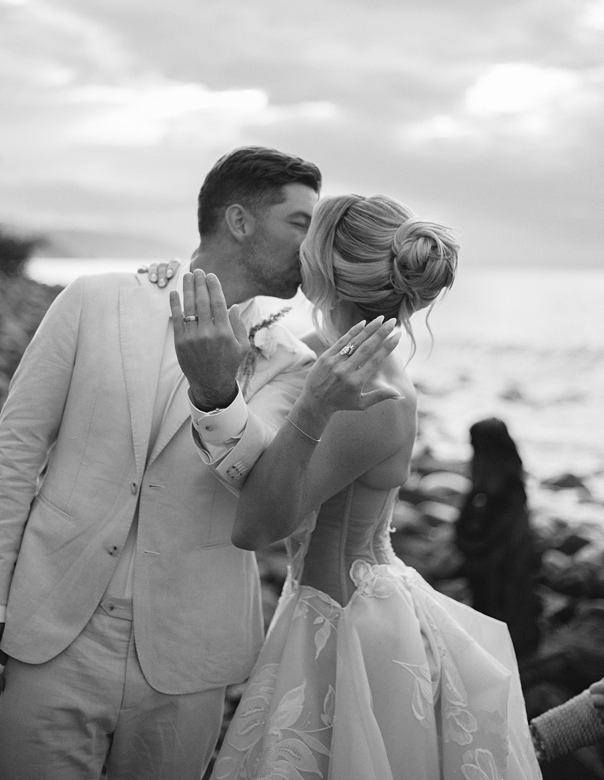 The ceremony took place on a wooden deck extending over the ocean, where the surrounding landscape provided both a dramatic and grounding backdrop. Light filtered through shifting clouds, and the movement of the water below created a natural rhythm that influenced the pacing of the moment. Rather than striving for ideal conditions, the couple embraced the environment as it was, allowing the experience to feel authentic to the place and time.