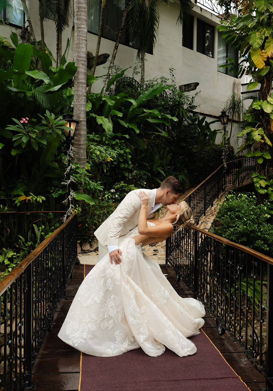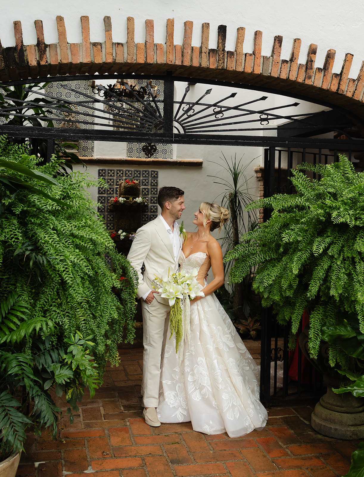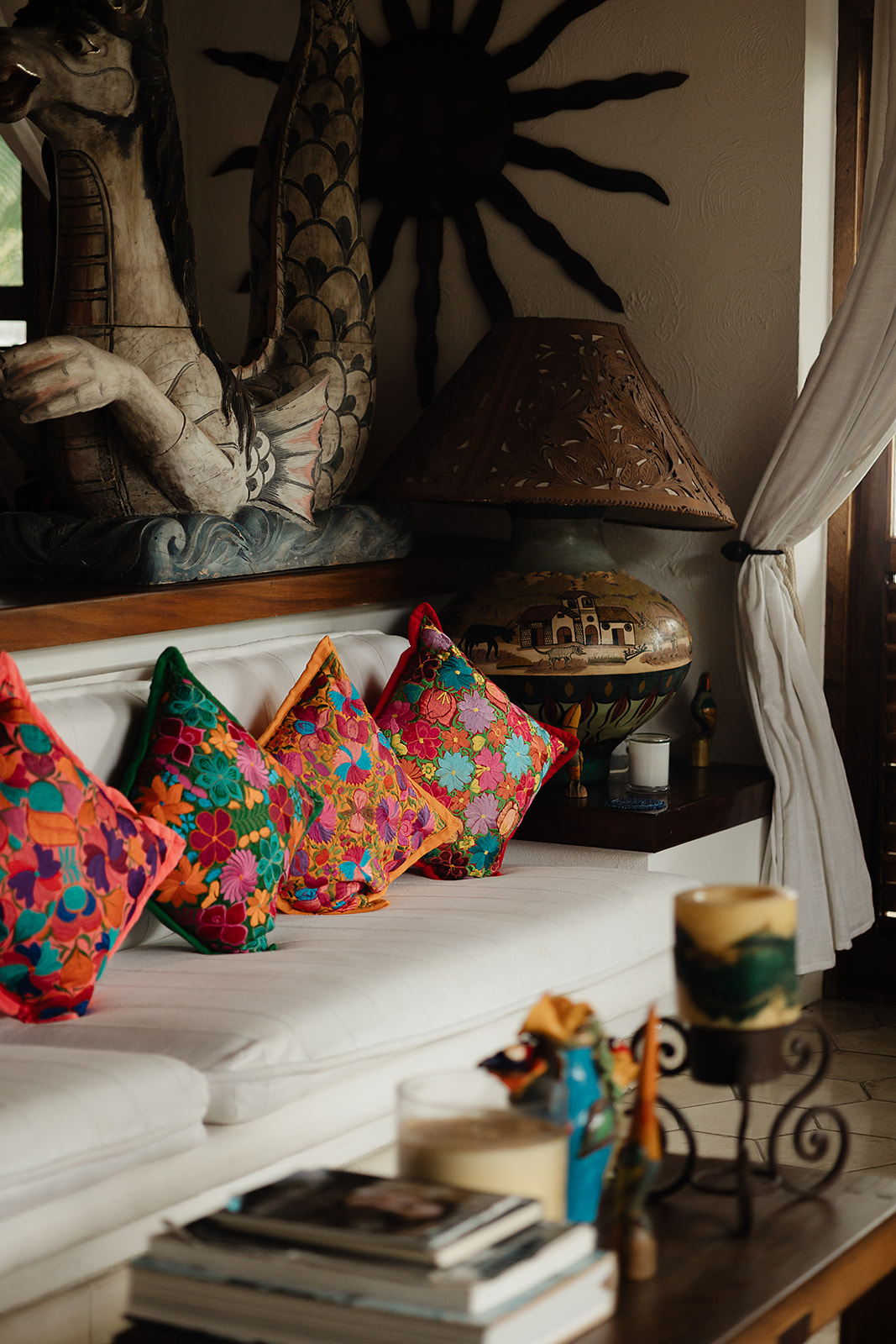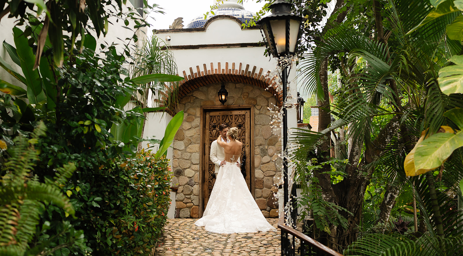 Set along the rocky coastline of Puerto Vallarta, their wedding unfolded in a setting that felt both intimate and expansive at the same time. The private villa where the celebration took place blended antique textures, vibrant color, and open-air architecture in a way that made the boundary between indoors and outdoors almost indistinguishable. Guests crossed a small walking bridge to enter the property, immediately stepping into an environment that felt removed from the pace of everyday life.