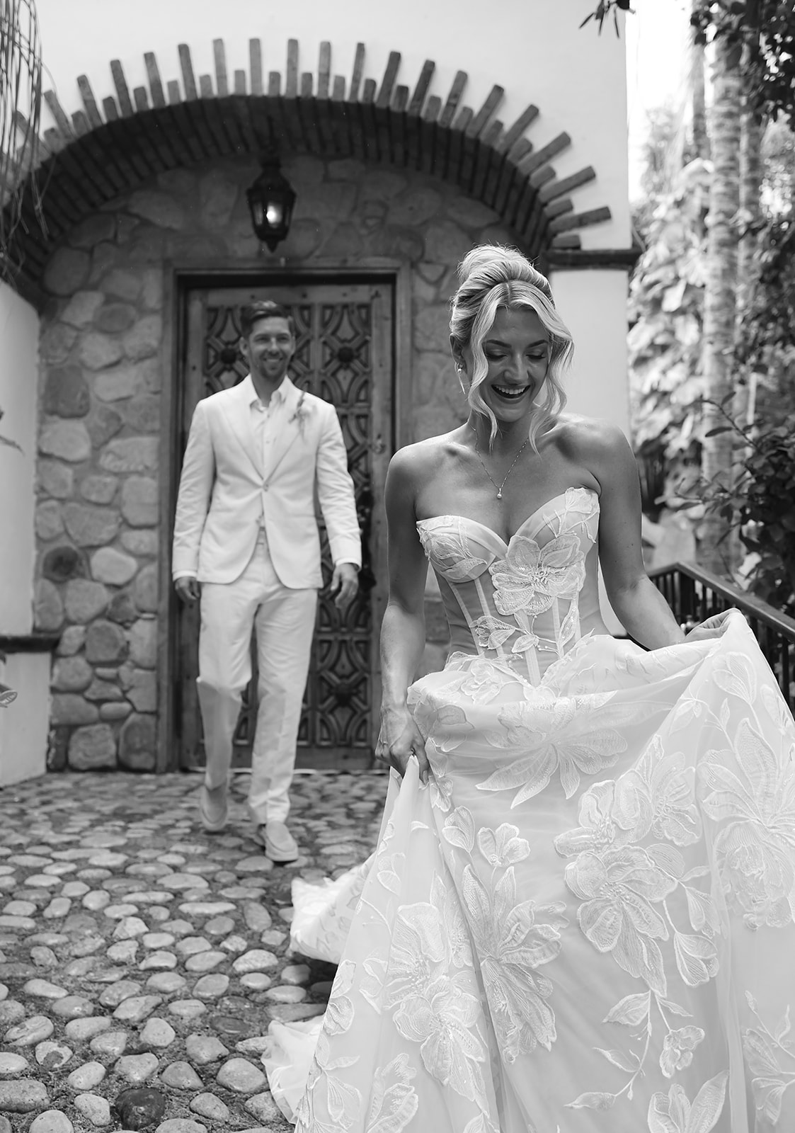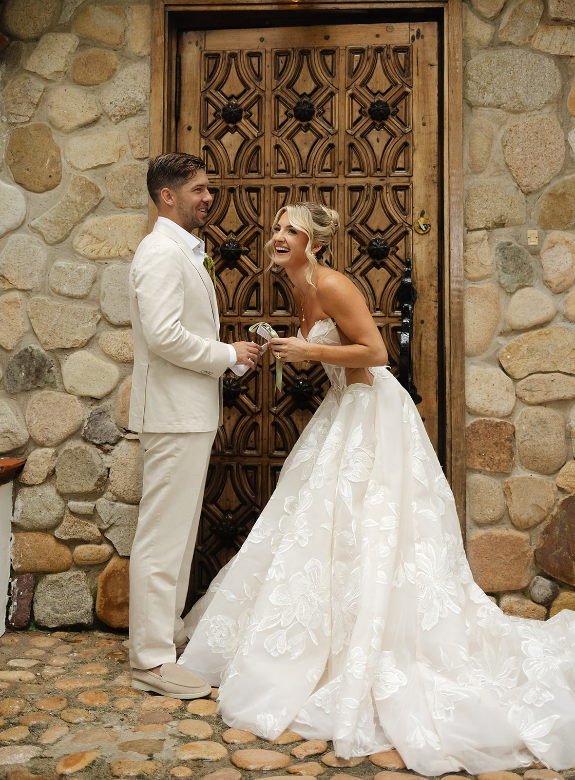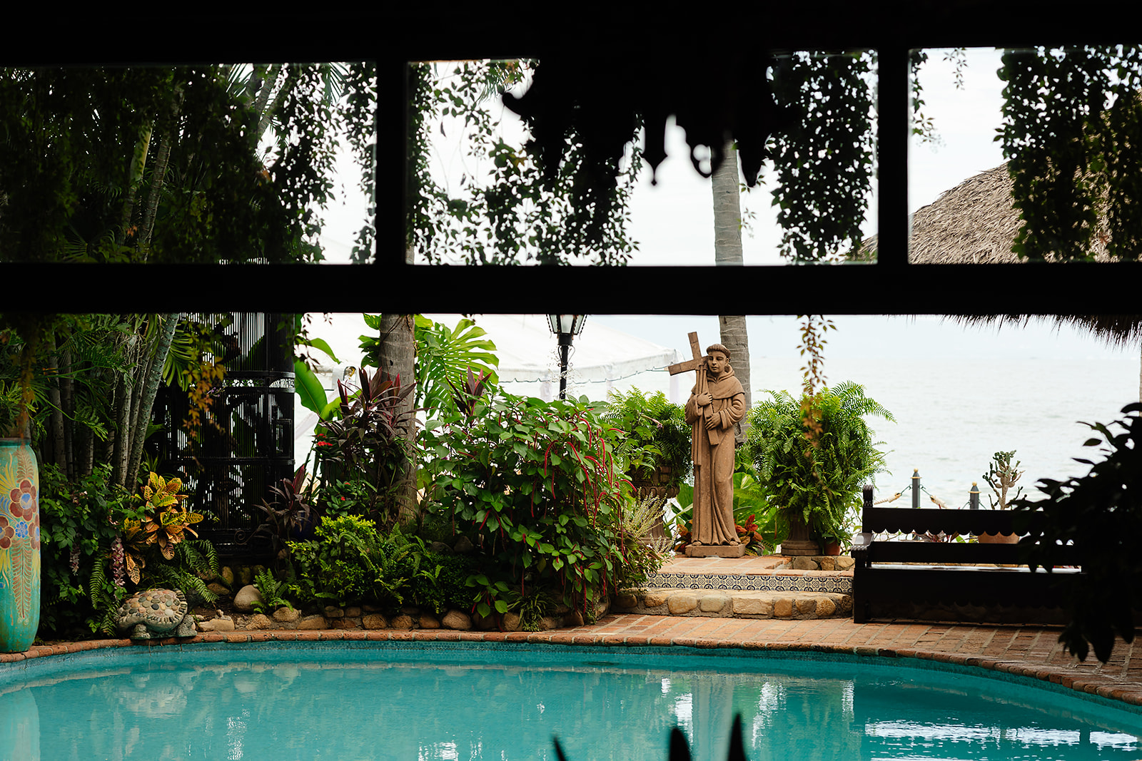 Set along the rocky coastline of Puerto Vallarta, their wedding unfolded in a setting that felt both intimate and expansive at the same time. The private villa where the celebration took place blended antique textures, vibrant color, and open-air architecture in a way that made the boundary between indoors and outdoors almost indistinguishable. Guests crossed a small walking bridge to enter the property, immediately stepping into an environment that felt removed from the pace of everyday life.