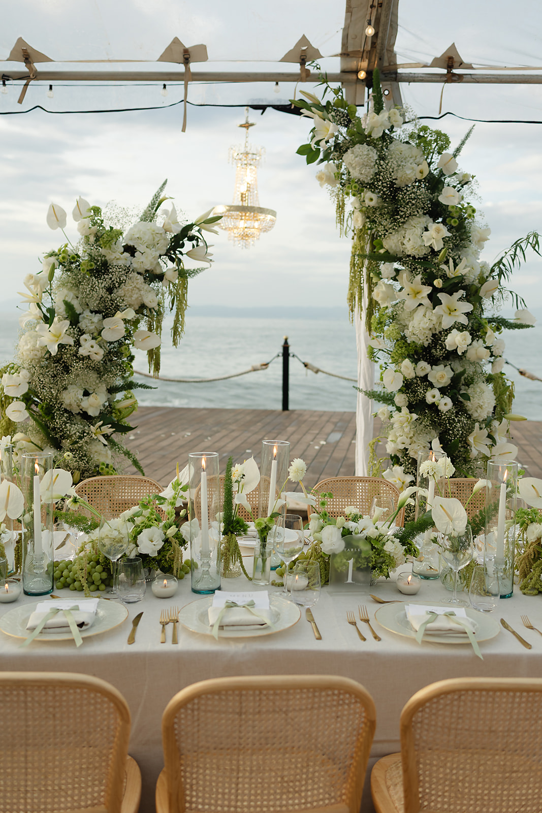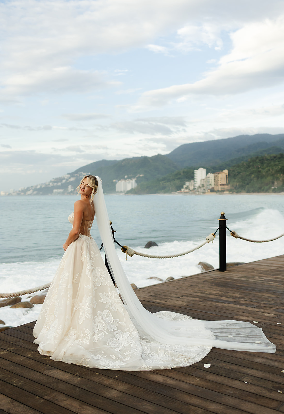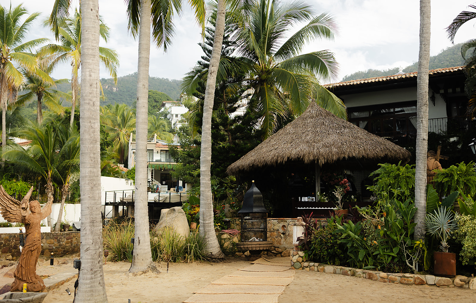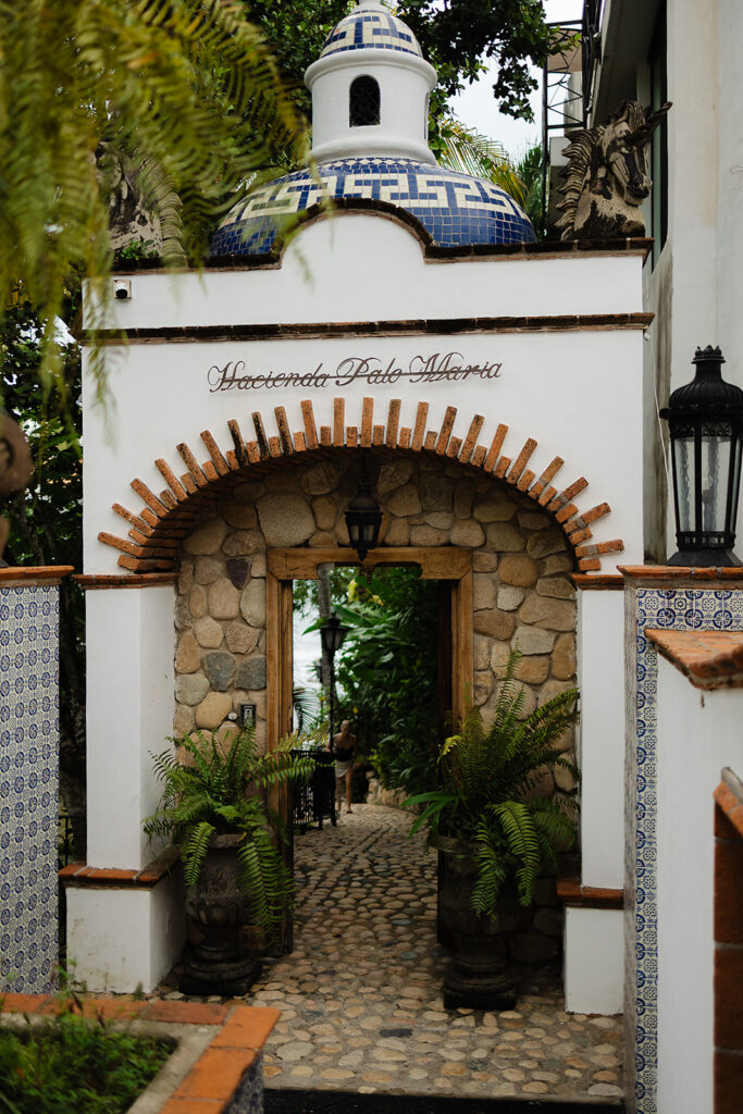Set along the rocky coastline of Puerto Vallarta, their wedding unfolded in a setting that felt both intimate and expansive at the same time. The private villa where the celebration took place blended antique textures, vibrant color, and open-air architecture in a way that made the boundary between indoors and outdoors almost indistinguishable. Guests crossed a small walking bridge to enter the property, immediately stepping into an environment that felt removed from the pace of everyday life.