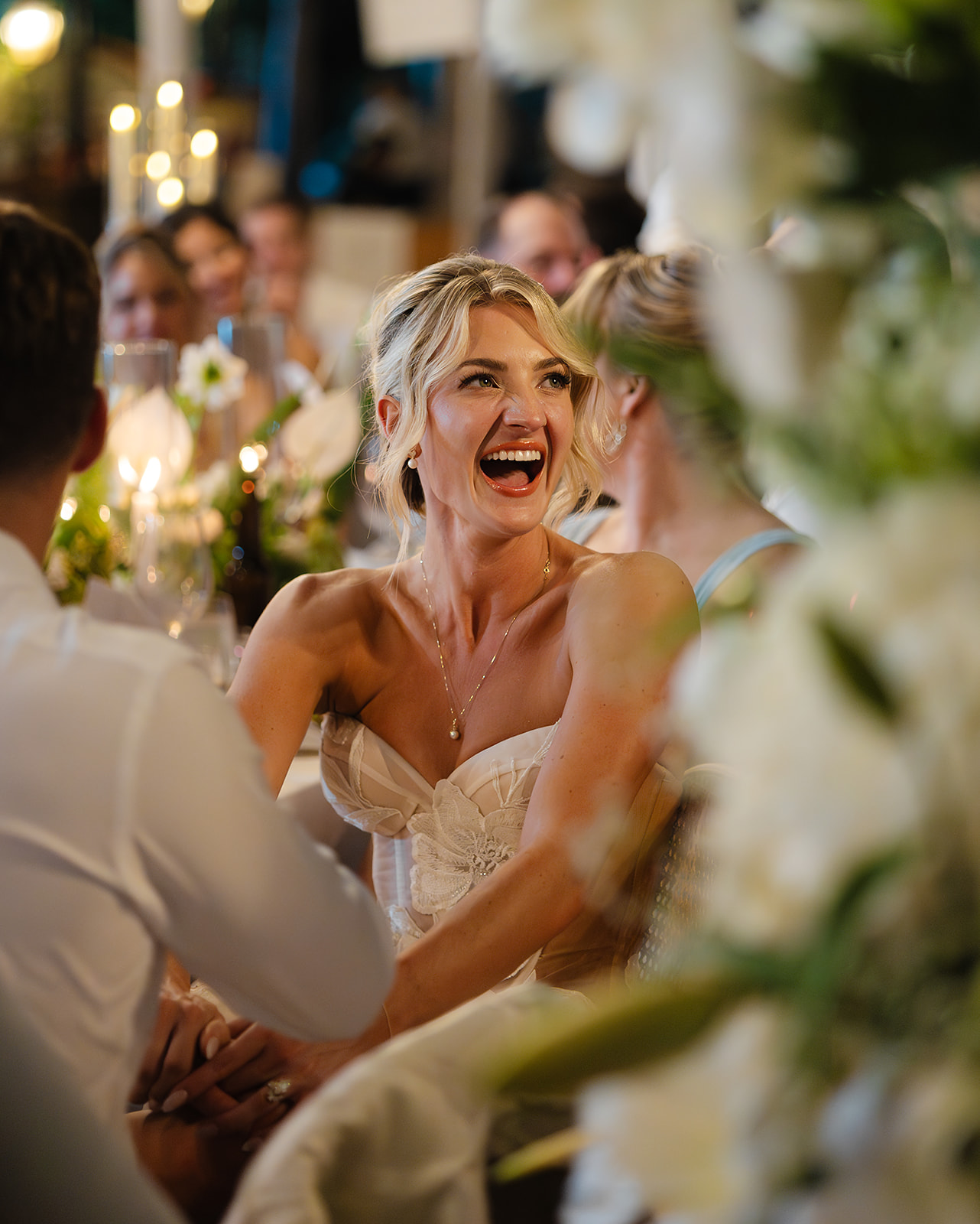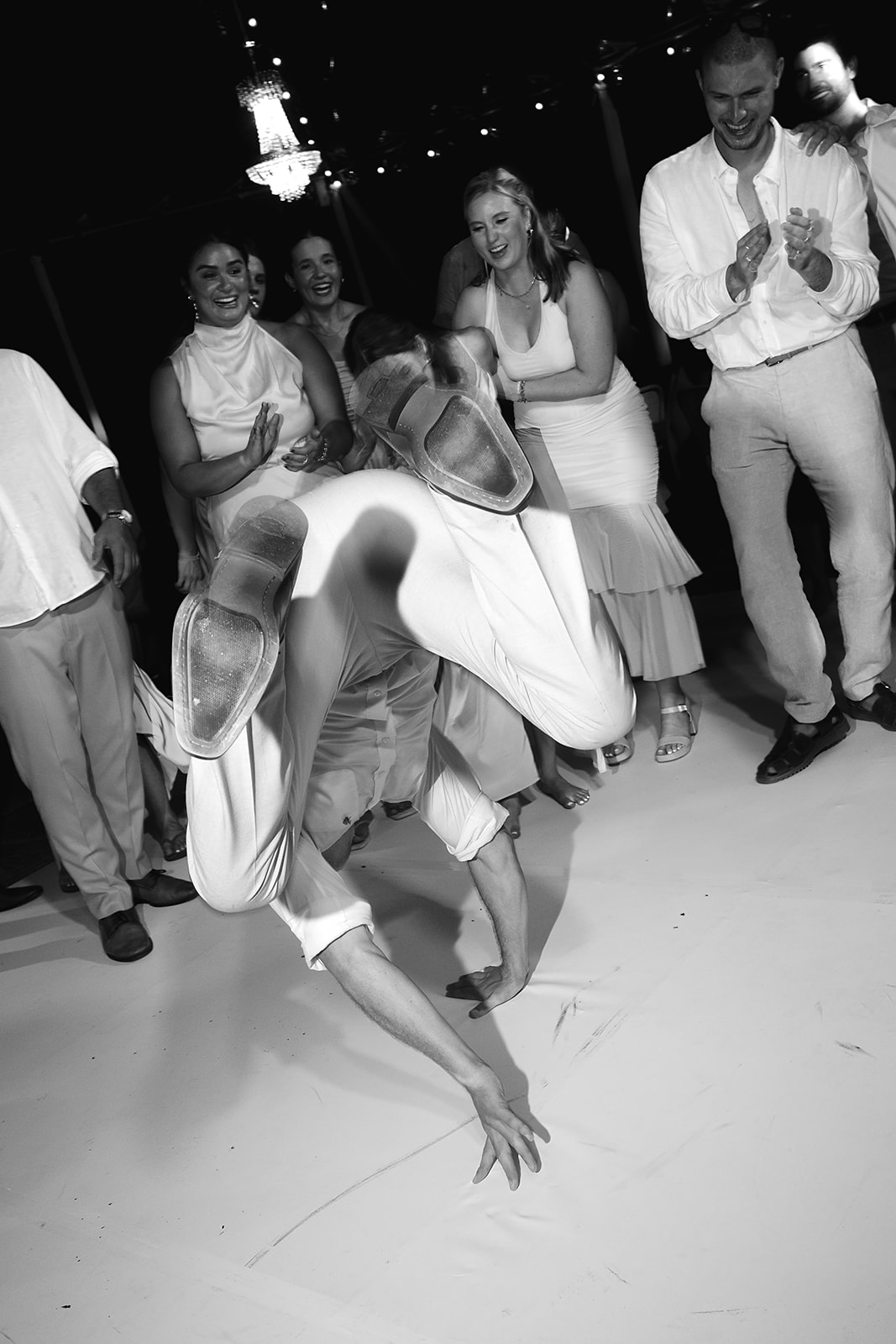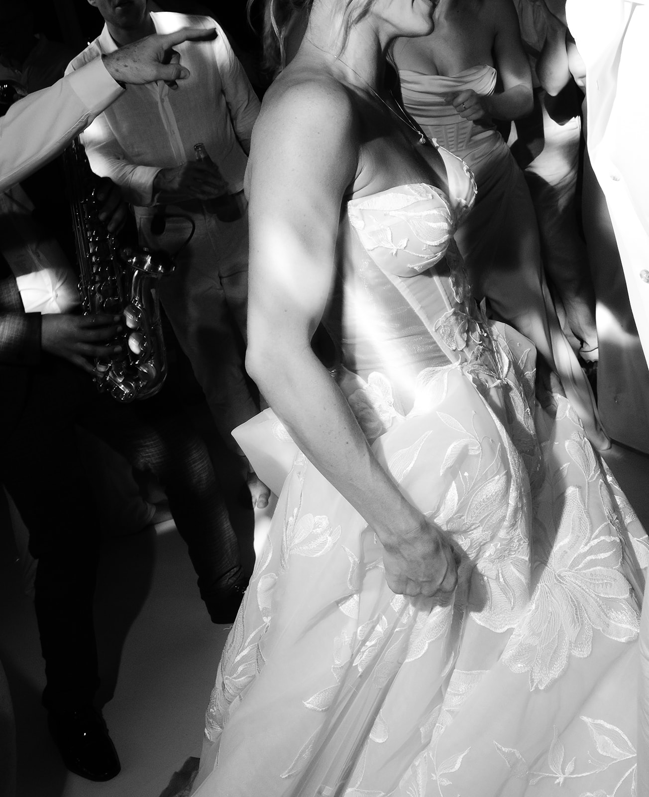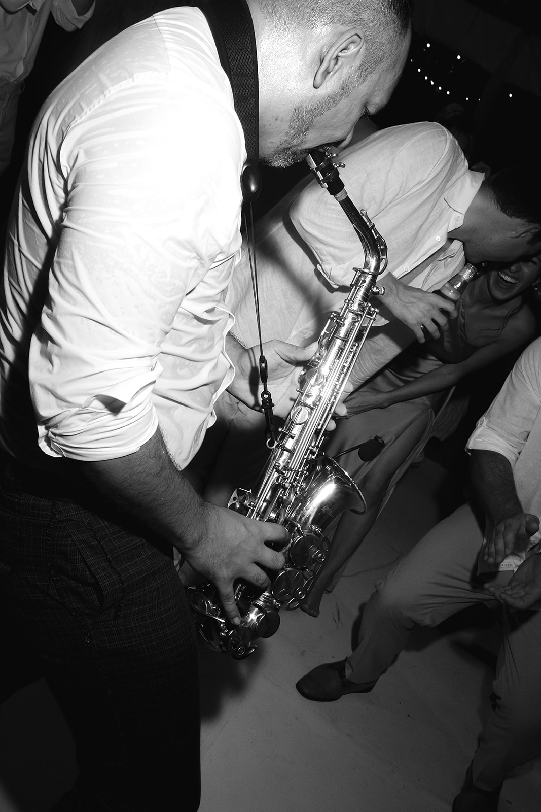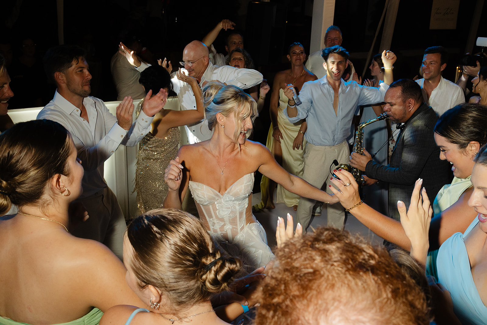 Music played a defining role in shaping the energy of the night. A live saxophonist moved through the space as guests danced, adding an unexpected layer of rhythm that elevated the emotional tempo of the celebration. Bartenders circulated with tequila, turning moments of spontaneity into shared memories that felt uniquely tied to place. The transition from daylight to vibrant, strobe-like reception lighting created a visual shift that mirrored the emotional arc of the day itself.